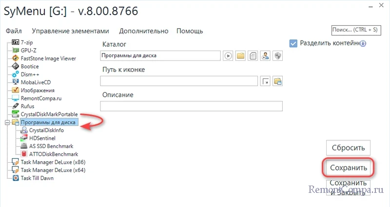 Объекты в меню SyMenu можно перетаскивать, формируя их порядок. При создании папок и подпапок добавление в них объектов выполняется также перетаскиванием. Опять же, не забываем сохранить внесённые изменения.