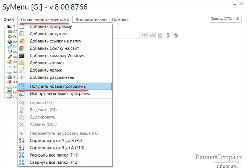 В меню SyMenu или разделе настроек «Управление элементами» кликаем «Получить новые программы».