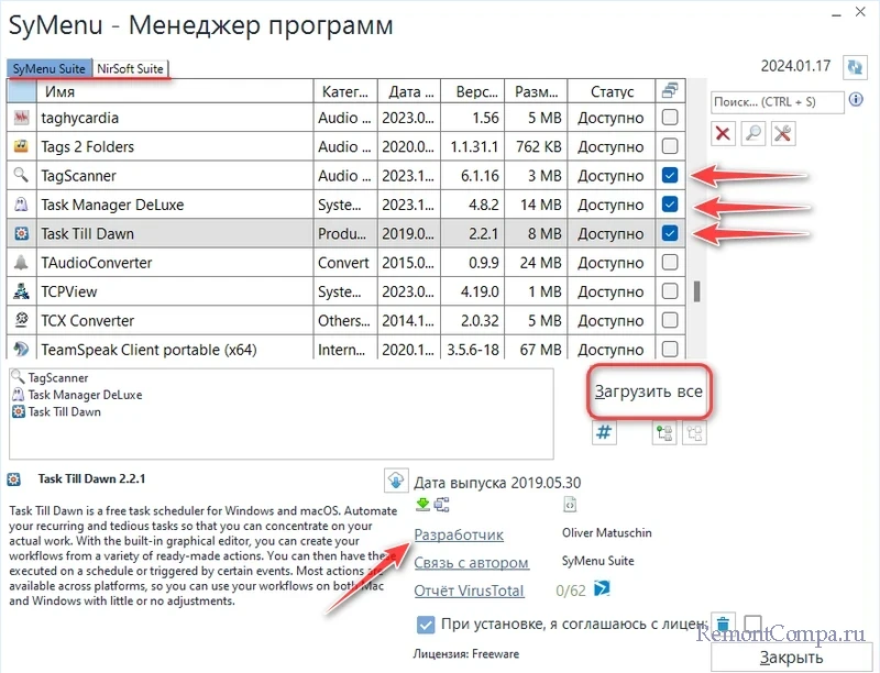 Для обновления портативных программ заходим в менеджер. Смотрим, для каких из них обнаружены новые версии. Устанавливаем галочки таких программ и обновляем их в пакетном режиме, нажав кнопку «Загрузить все». Если обновление доступно только для одной программы, выделяем её и жмём кнопку загрузки для этой программы.