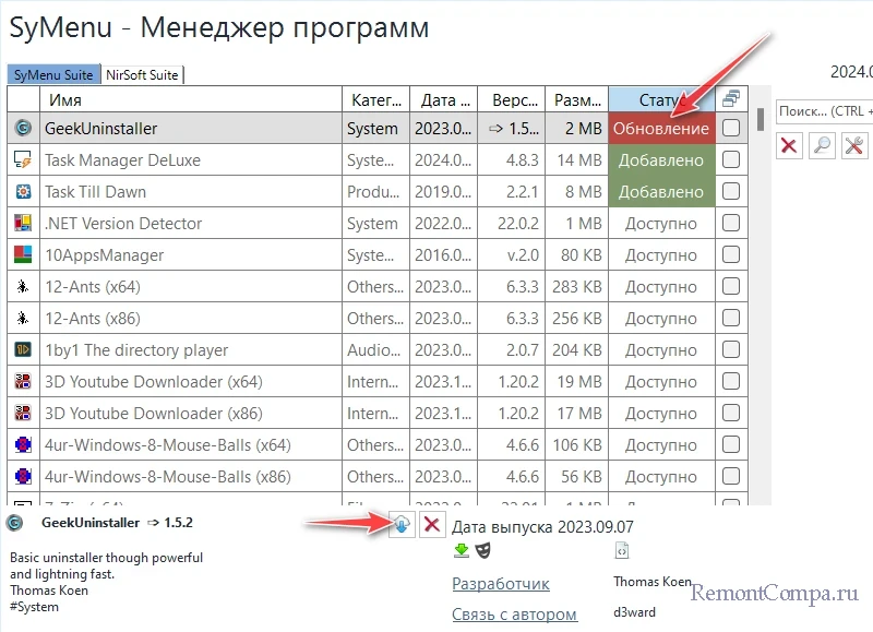Перед нами появляется каталог портативных программ. Разные таковые собраны в одном из разделов каталога «SyMenuSuite». В другом разделе – «NirSoftSuite» - отдельно собраны портативные программы от известного разработчика NirSoft. Программы можно искать с помощью поиска по каталогу.