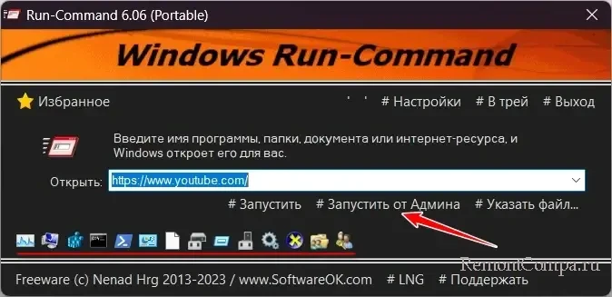 А представить такое нам поможет утилита Run-Command. Она бесплатная, портативная. Являет собой альтернативу системному командлету «Выполнить» с расширенными возможностями. Утилита дублирует все возможности командлета: предусматривает окошко открытия программ, настроек, путей, веб-адресов, файлов. При этом настройки и функции при необходимости можем открыть от имени администратора, для этого окошко утилиты предусматривает специальную опцию. Также для выполнения любых команд от имени администратора можем при запуске этих команд удерживать клавишу Ctrl.