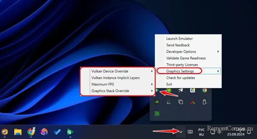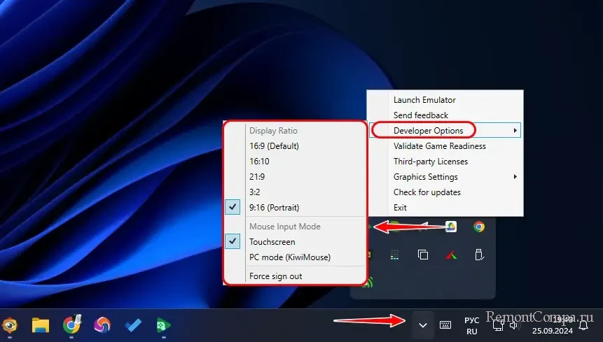 Их и варианты управления эмулятором можем выбрать в его настройках «Developer Options», доступных в контекстном меню на значке эмулятора в системном трее.
