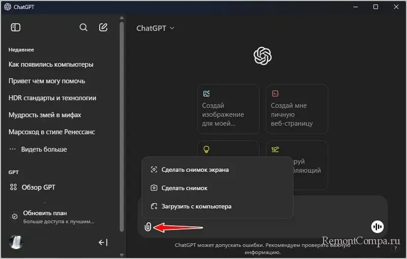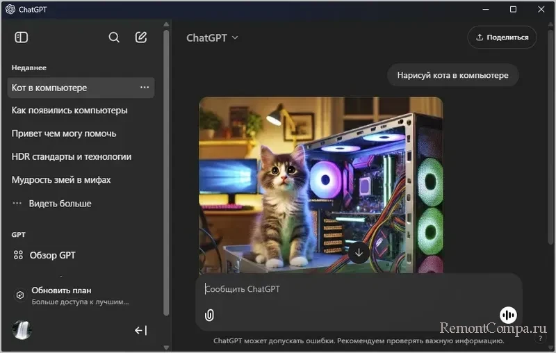 Официальное приложение ChatGPT для Windows 10 и 11 доступно в магазине Microsoft Store. Доступно бесплатно. Работает только при подключении к Интернету. Дублирует интерфейс веб-версии и предусматривает все её возможности. А это возможность общения с нейросетевым ботом текстом. Возможность отправлять ему изображения и общаться относительно их содержимого, однако при бесплатном доступе к ChatGPT эта возможность лимитирована.