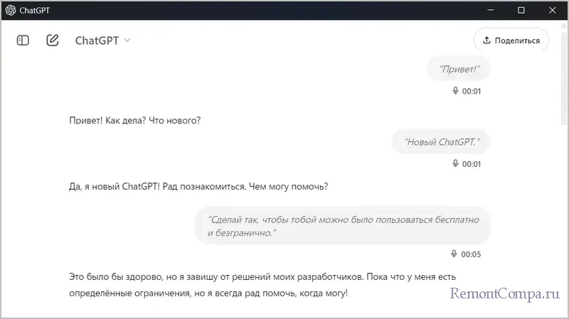 При бесплатном доступе к ChatGPT голосовое общение ограничено – лишь несколько минут в месяц. В скором времени голосовой чат станет доступен и в веб-версии.