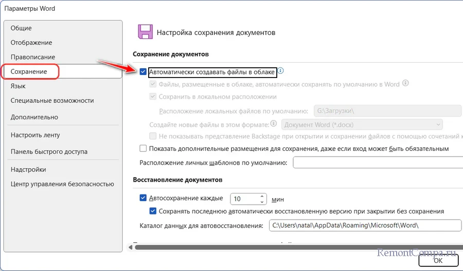 Во вкладке «Сохранение» смотрим блок «Сохранение документов». Предустановленная галочка настройки «Автоматически создавать файлы в облаке» и есть новой дефолтной установкой Microsoft Word.