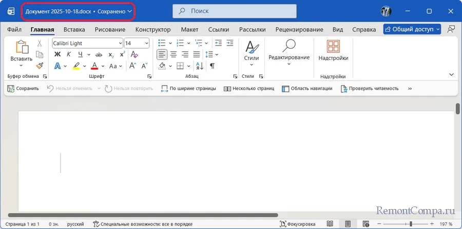 В обновляемых версиях Microsoft Word автосохранение в облако включается с первого набранного нами символа. Вместо стандартного «Документ1.docx» созданный нами файл получает автоматическое имя на основе даты, например, «Документ-2025-10-18.docx».