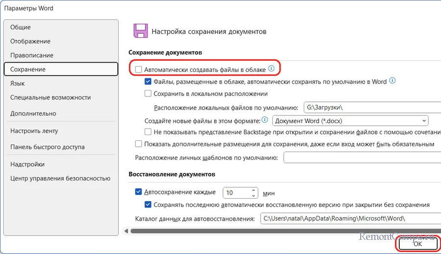 Как убрать автосохранение документов Word в облаке