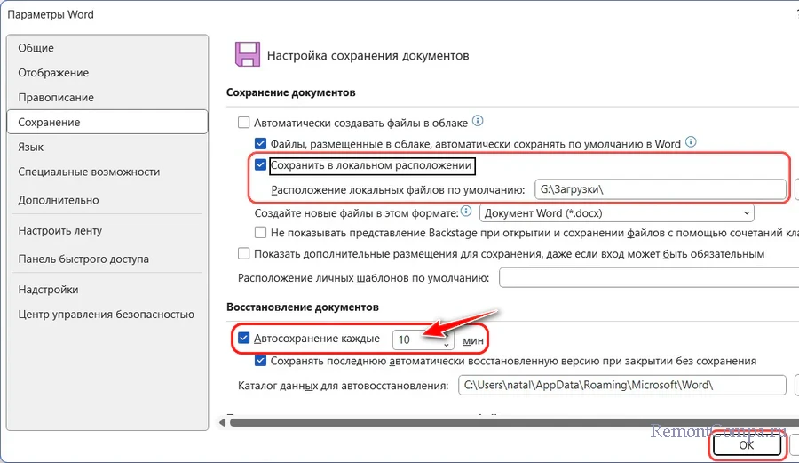 По желанию, друзья, в блоке «Сохранение документов» можем внести ещё кое-какие настройки для удобства работы с Microsoft Word. Можем установить галочку сохранения документов в локальном расположении и указать путь на диске компьютера. Этот путь будет предлагаться нам при ручном сохранении документов, и мы сможем либо быстро сохранять документы по этому пути, либо выбирать нужные пути.