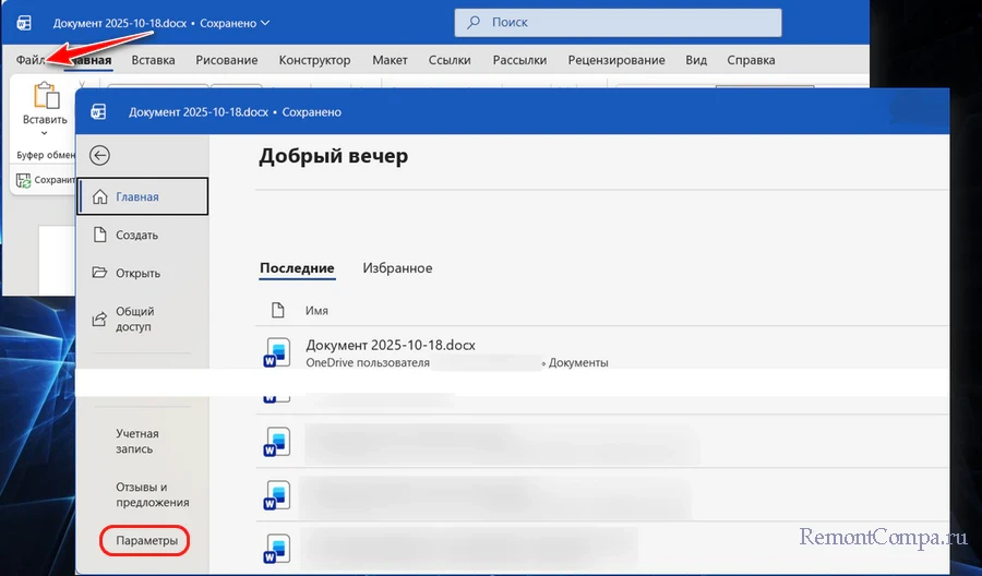 Для настройки локального сохранения документов жмём меню «Файл», далее внизу жмём «Параметры».