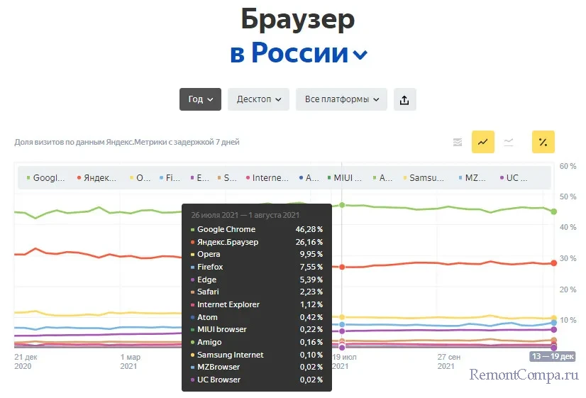 На рынке браузеров 2021 год выдался тихим и спокойным. Год продолжил существовавшую тенденцию превалирования платформы Chromium в виде разных браузеров, использующих её, и сдавания позиций Mozilla Firefox и его клонов - единственной на сегодняшний день альтернативы в плане движка рендеринга. По данным статсервиса Яндекс.Радар, в России доли десктопных браузеров распределились так: