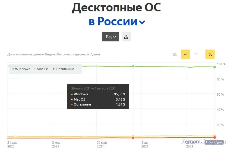 По данным Яндекс.Радар, в России по итогам 2021 года на рынке десктопных операционных систем лидирует Windows с долей более 95%, за ней идёт Mac с долей менее 4%, все остальные операционные системы занимают долю менее 2%. Внутри доли самой Windows лидирует Windows 10 с долей больше 61%, за ней идёт Windows 7 с долей более 26%, и менее 6% — это доли иных версий Windows.