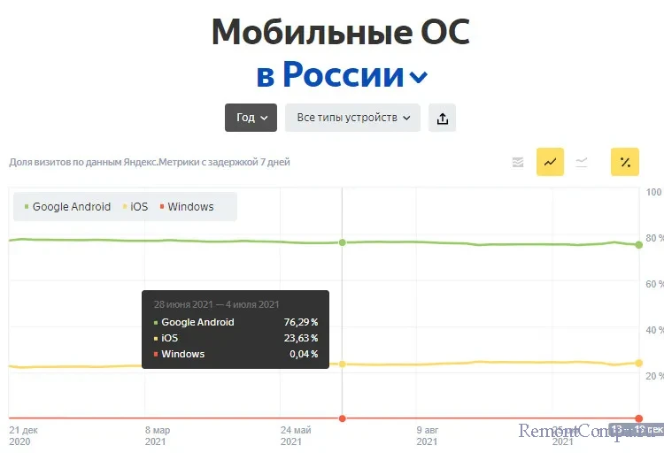 На рынке мобильных операционных систем лидирует Android с долей более 76%, iOS имеет долю более 23%, у всех остальных доля менее 1%.
