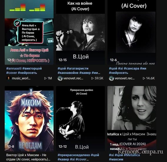Кому интересно, юзайте в TikTok хэштеги #aicover, #нейрокавер, #кавер, #топкавер, #ии, #ai, #нейросеть. Или в поиске ищите своих любимых музыкантов.
