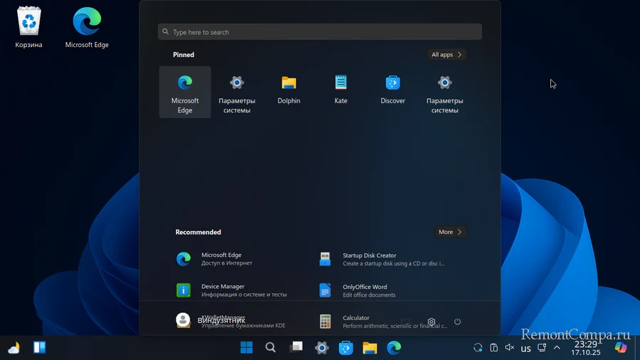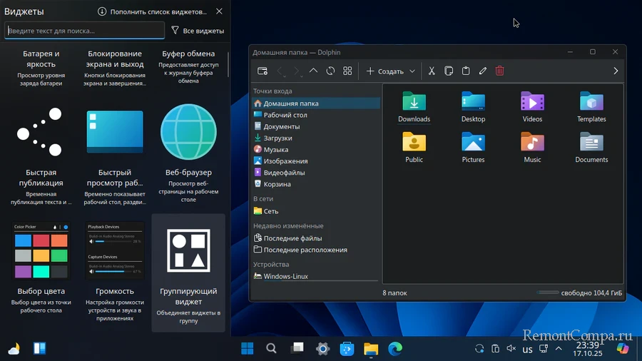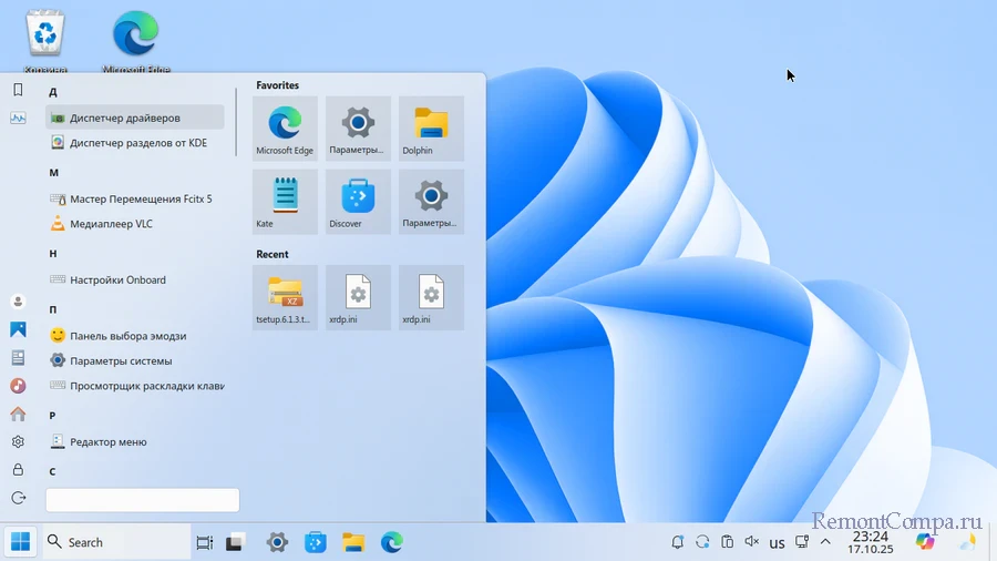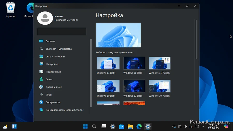 В целом имитация Windows 11 в Winux выполнена неплохо. В стилизованных под Windows 11 темах оформления реализован эффект слюды Mica Fluent Design. Mica, системные окна со скруглёнными углами, иконки и меню в стиле Windows 11 хорошо передают её характер и настроение. Есть разные темы – тёмные и светлые, с центрированным меню «Пуск» и расположенным слева.