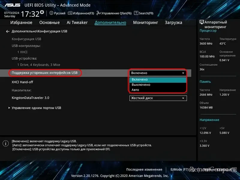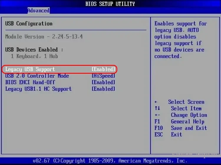Как проверить, включена ли настройка Legacy USB support, и если отключена, то как включить?