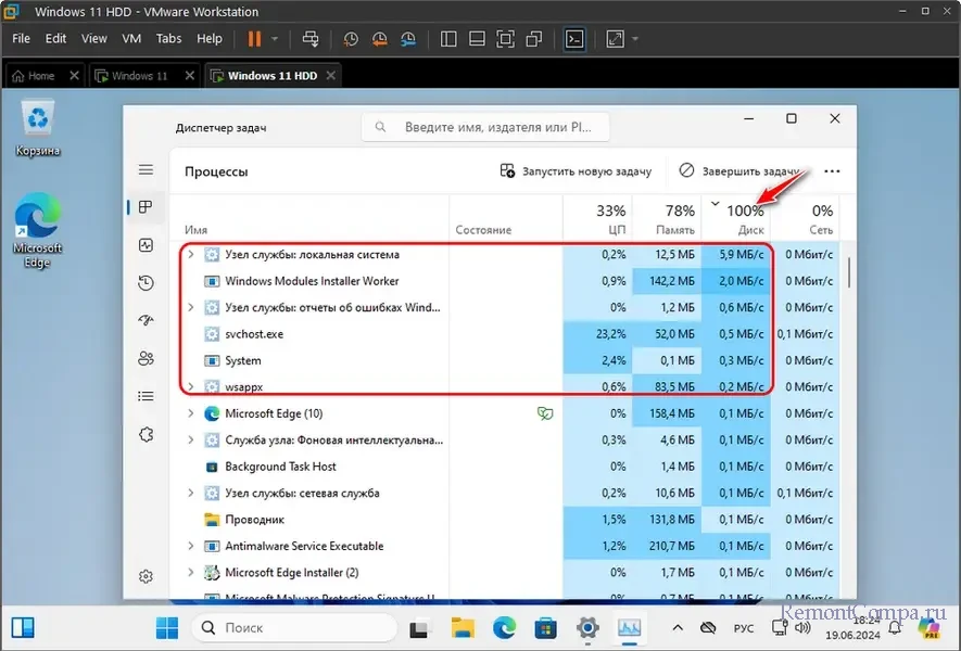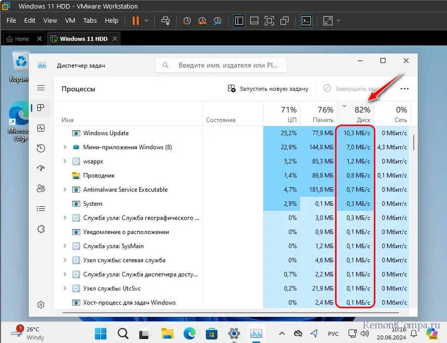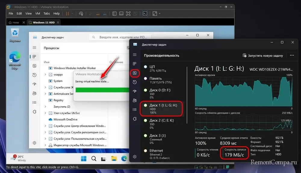 Эффективность кэширования PrimoCache в оперативной памяти мы исследовали на примере работы гипервизора. Запустили расположенную на HDD виртуальную машину в сложнейших условиях: даже сама по себе работа гостевой Windows 11 – это большое испытание для HDD, но мы ещё и включили серьёзно нагружающую системные ресурсы установку системных обновлений. В диспетчере задач Windows 11 видим, как установка обновлений отправила HDD в нокаут – он загружен на 100%.