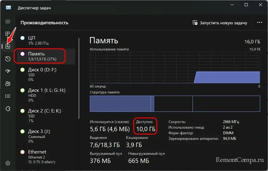 Перед использованием PrimoCache, друзья, исследуйте постоянный свободный объём оперативной памяти. Максимально нагружаем систему – запускаем все программы и игры, которые часто используются одновременно. Далее в диспетчере задач, в разделе производительности смотрим вкладку «Память», здесь в числе прочих данных будет указано, сколько оперативной памяти доступно, это свободная память. Это нужно для определения, сколько памяти можем выделить для кэширования PrimoCache без ущерба для других своих задач.