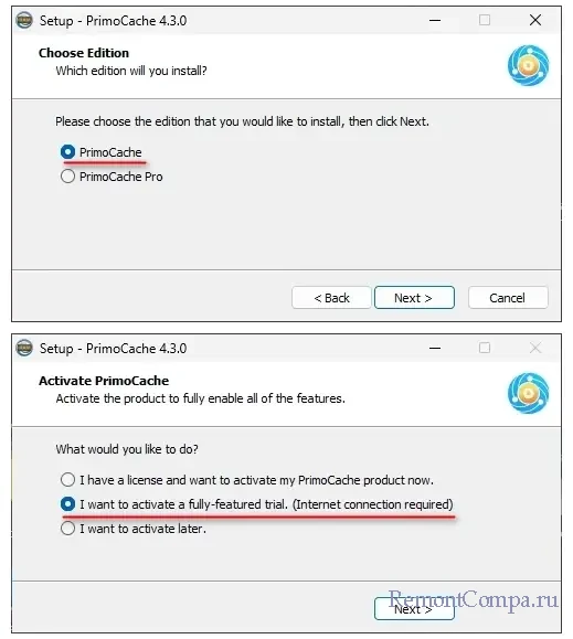 Устанавливаем программу PrimoCache. В процессе установки на разных этапах выбираем обычную версию PrimoCache и пробное её использование.