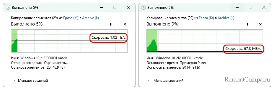 При обычном копировании данных кэш проявил себя на старте операции, но, увы, не увидели мы при её выполнении невероятных синтетических скоростей оперативной памяти. Лишь немногим более 1 Гб/с. Для развития большей скорости памяти нужен больший её объём. За пределами кэша пошла запись на диск напрямую с существенной просадкой в скорости. Тем не менее, при копировании небольших объёмов данных толк с такого ускорения HDD будет ощутим.