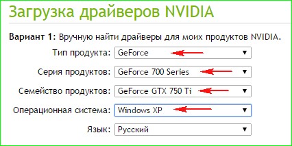 Тип продукта: GeForce. Серия продуктов: GeForce 500 Series. Операционная система: Windows 8 64-bit. Язык: Русский. Нажимаем кнопку «Поиск».