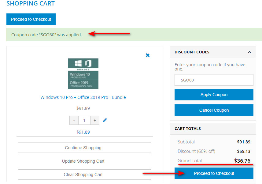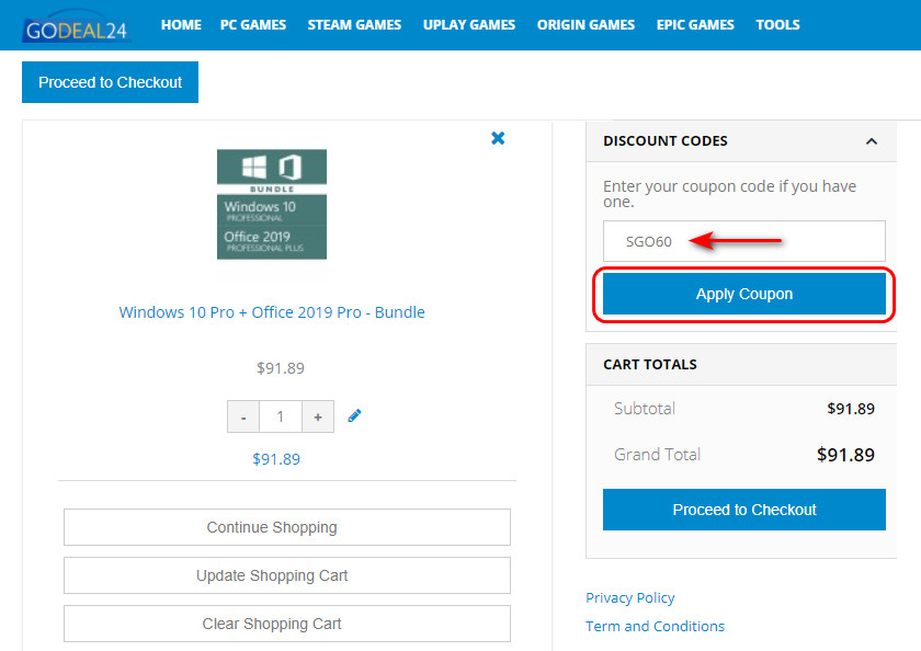 В корзине в графу «Discount codes» внесите один из указанных выше - SGO60 или SGO45 – промокодов, тот, что соответствует вашей скидке. Жмите «Apply Coupon».