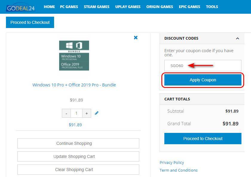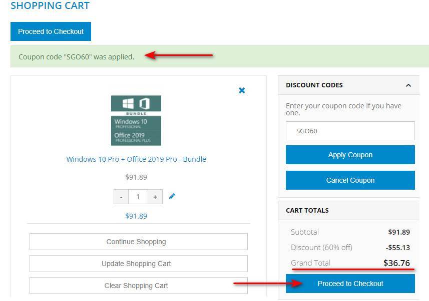 В корзине у нас есть специальный блок для применения промокодов - «Discount codes», сюда вводим промокод, соответствующий скидке – либо SGO60, либо SGO45. И нажимаем «Apply Coupon».