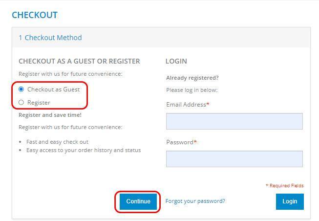А дальше нужно либо зарегистрироваться на сайте магазина (вариант «Register»), либо можно не регистрироваться, а оформить покупку в качестве гостя (вариант «Checkout as Guest»). Но в любом случае необходимо вносить свои данные, а если вы зарегистрируетесь, у вас будет за аккаунтом вестись история покупок. Выбирайте, что вам нужно.