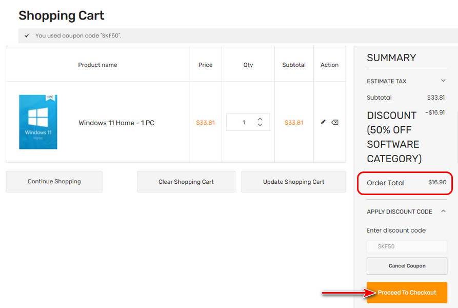 В графу «Apply Discount code» вводим промокод – SKF50 или SKF62, тот, что соответствует скидке на выбранный нами продукт. Жмём «Apply Discount».