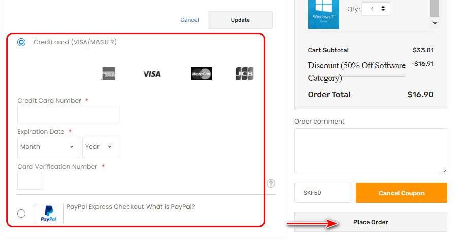 Далее выбираем метод оплаты – банковскую карту или PayPal, вносим платёжные данные. Жмём «Place Order» и совершаем оплату покупки.