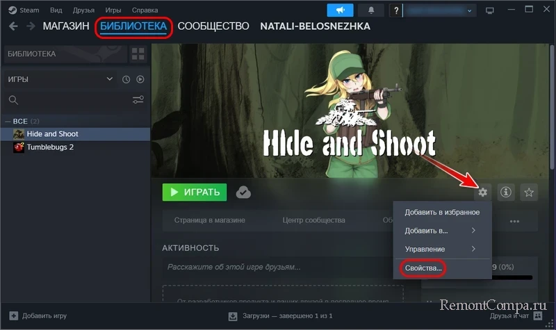 Одна из примечательных возможностей Steam – функция проверки целостности файлов игр, установленных через игровой клиент. Функция восстанавливает повреждённые или недостающие файлы игры. А именно они могут вызывать ошибку «Application load error 5: 0000065434». Заходим в библиотеку Steam. Жмём кнопку-шестерёнку, выбираем «Свойства».