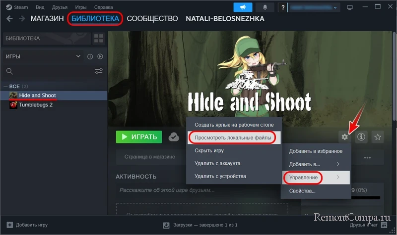 Открываем в файловой системе путь установки игры. Для этого можно воспользоваться возможностью библиотеки Steam. Жмём кнопку-шестерёнку игры, выбираем «Управление → Посмотреть локальные файлы».