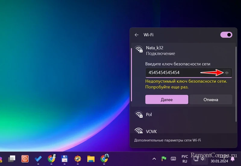 Использование неверного пароля – основная причина ошибки «Недопустимый ключ безопасности сети». Нужно проверить правильность введённого пароля. Можем нажать значок глазка в поле ввода пароля, чтобы видеть введённые символы и отследить правильность ввода.