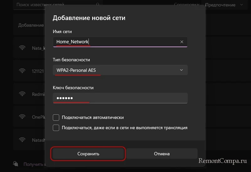 Вводим имя сети. Тип безопасности выбираем «WPA2—Personal AES». В поле «Ключ безопасности» вводим пароль от сети Wi-Fi. Жмём «Сохранить».