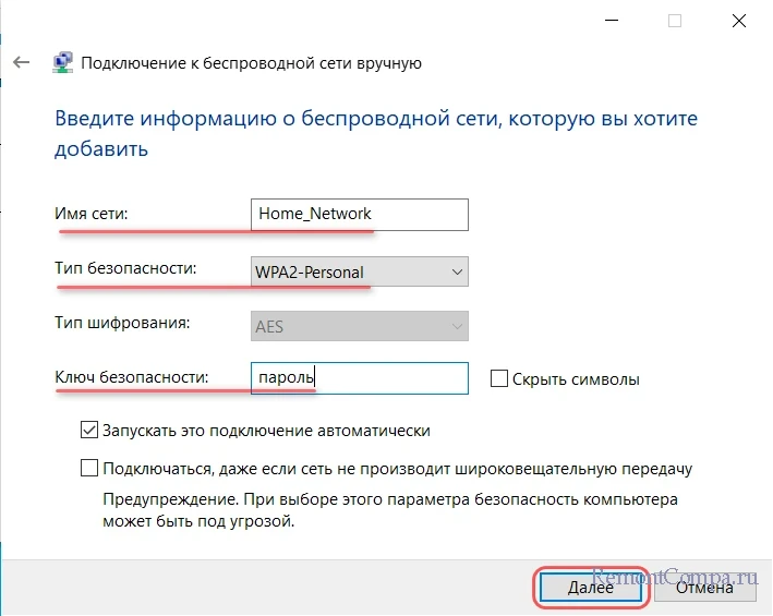 Вводим имя сети. Тип безопасности выбираем «WPA2—Personal». В поле «Ключ безопасности» вводим пароль от сети Wi-Fi. Жмём «Далее».