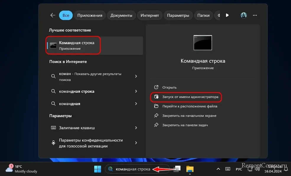 Можем запустить командную строку из системного поиска, выбрав пункт запуска от имени администратора.