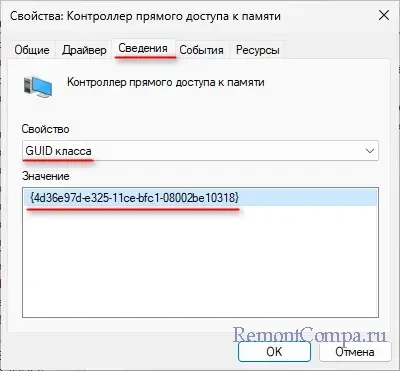 В диспетчере устройств Windows двойным кликом открываем свойства причинного устройства. Во вкладке «Сведения» в графе «Свойство» выставляем «GUID класса». И смотрим его значение.