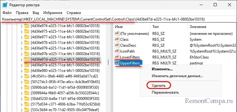 HKEY_LOCAL_MACHINE\System\CurrentControlSet\Control\Session Manager\Memory ManagementДалее ищем папку со значением «GUID класса» устройства. Раскрываем её. Смотрим, есть ли внутри неё параметры с наименованиями «LowerFilters» и «UpperFilters». Если есть, удаляем их, вызвав на них контекстное меню и выбрав «Удалить».