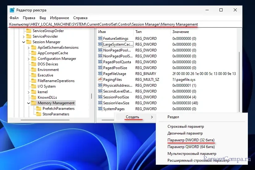 HKEY_LOCAL_MACHINE\System\CurrentControlSet\Control\Session Manager\Memory ManagementСмотрим, есть ли по этому пути параметры с наименованиями «PoolUsageMaximum» и «PagedPoolSize». Если нет, создаём их. На пустом месте правой панели редактора вызываем контекстное меню, выбираем «Создать», далее «Параметр DWORD (32 бита)».