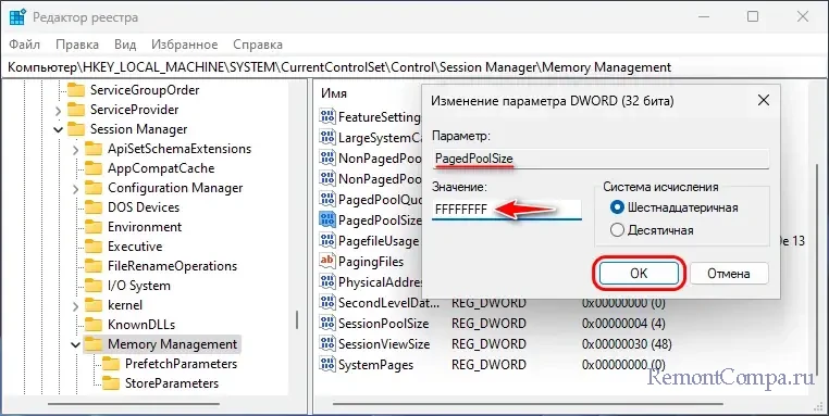 Затем на каждом из созданных параметров делаем двойной клик и вносим изменения. Для параметра PagedPoolSize выставляем значение: