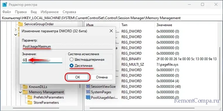 Для параметра PoolUsageMaximum выставляем десятичную систему исчисления и вводим значение: