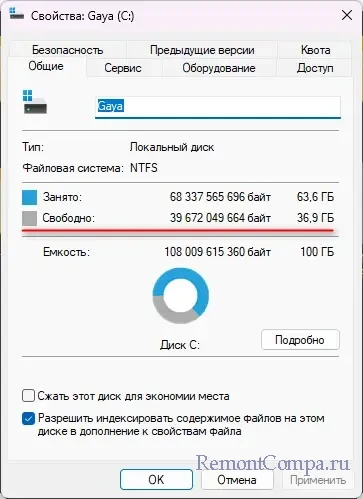 Рассматриваемая ошибка может появляться из-за проблем с диском. Для начала проверяем, достаточно ли места на диске С. Возможно, он захламлён, и системным обновлениям, компонентам Microsoft или сторонним программам попросту некуда установиться. В проводнике Windows открываем свойства диска С и смотрим, сколько у нас свободного места.