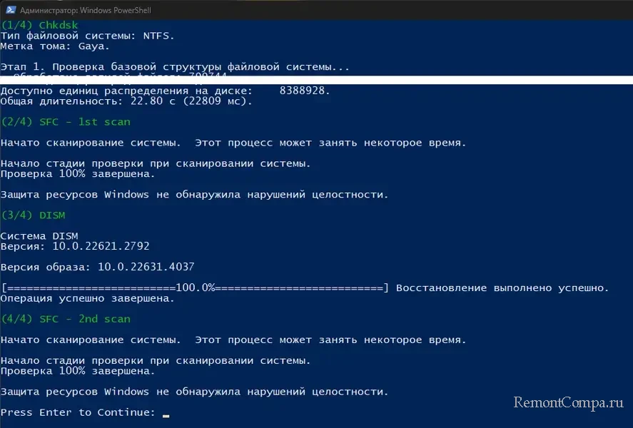 Комплексное сканирование и исправление повреждений Windows включает 4 этапа. Сначала средством Chkdsk проверяется и исправляется диск С и файловая система. Затем средством Sfc проверяются системные файлы. Если какие-то из них повреждены, они восстанавливаются. Далее средством Dism выполняется проверка и восстановление хранилища компонентов, откуда берутся системные файлы для восстановления. И потом снова запускается Sfc, это средство вновь проверяет системные файлы и пытается исправить те файлы, которые не были исправлены при первом его запуске.