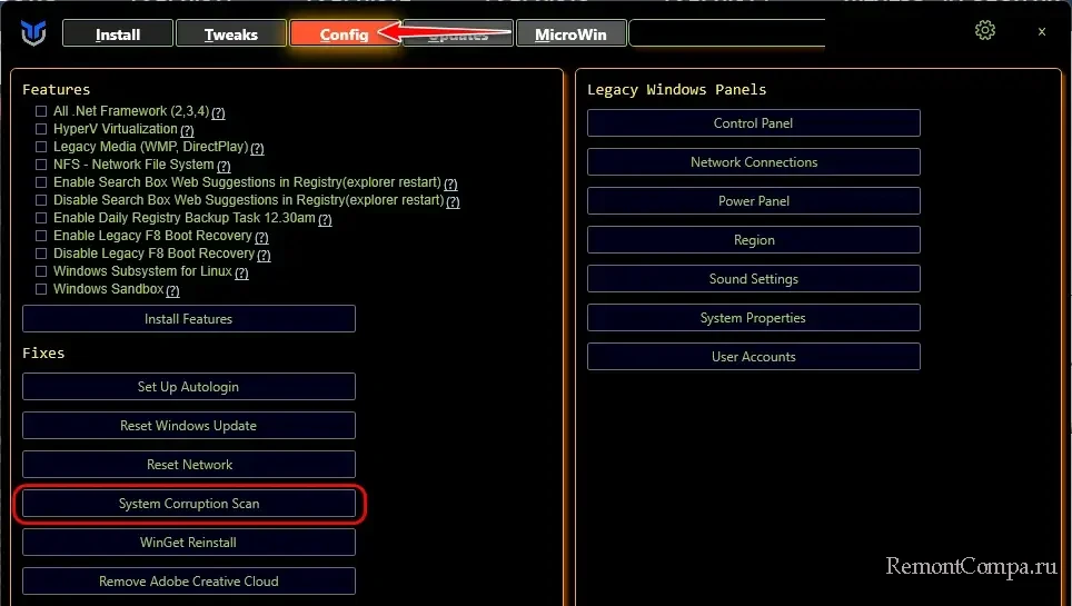 Комплексное сканирование и исправление повреждений Windows запускается в программном разделе «Config». Это функция System Corruption Scan, являет собой автоматизированный запуск определённых команд консольных средств Chkdsk, Sfc и Dism. Жмём кнопку запуска этой функции.