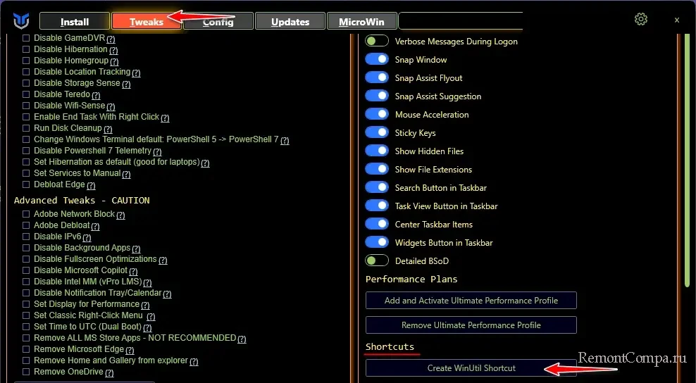 irm "https://christitus.com/win" | iexВ дальнейшем WinUtil можно запускать с помощью ярлыка, созданного в самой же программе.