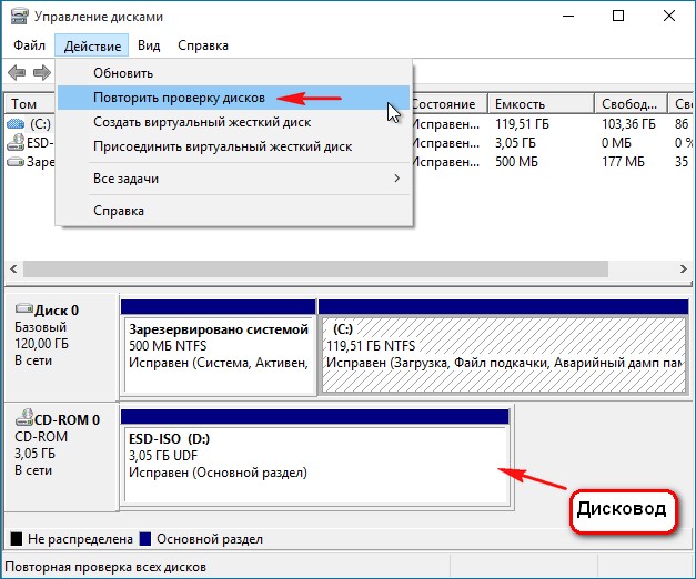 Откройте "Управление дисками" и посмотрите, есть там дисковод или нет, если нет, то нажмите Действие ->Проверить проверку дисков
