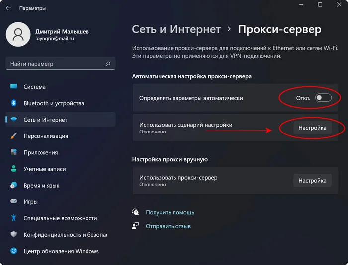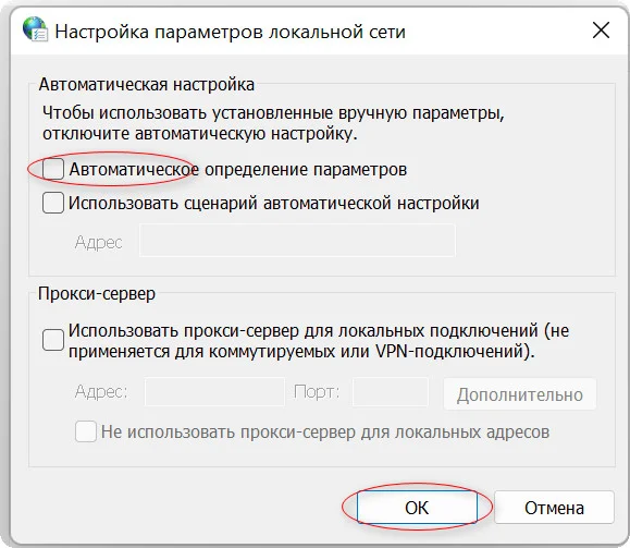 6. То же самое проделываем с пунктом "Использовать прокси-сервер", то есть чекбокс должен быть в положении "Откл."