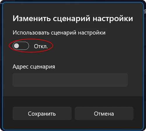 5. Нажимаем на кнопку "Настройка" рядом с "Использовать сценарий настройки" и отключаем его.