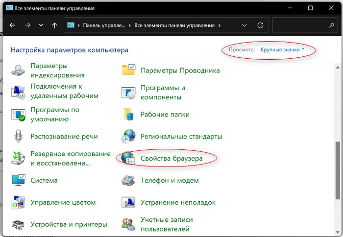 2. Находим "Свойства браузера" и заходим в них. Если же такого пункта нет, то в верхней части окна строку "Просмотр" переключаем в "Крупные значки".
