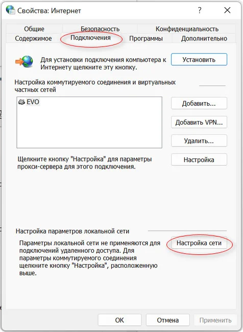 3. Во всплывшем окне "Свойства: Интернет" заходим в "Подключения" и щелкаем по "Настройка сети".