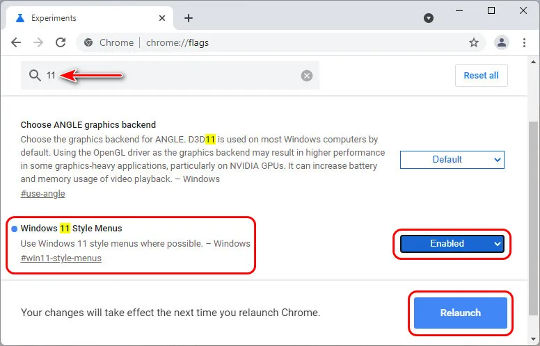 В поле поиска вписываем «11» и для настройки «Windows 11 Style Menus» ставим значение «Enabled». Затем перезапускаем браузер кнопкой «Relaunch».